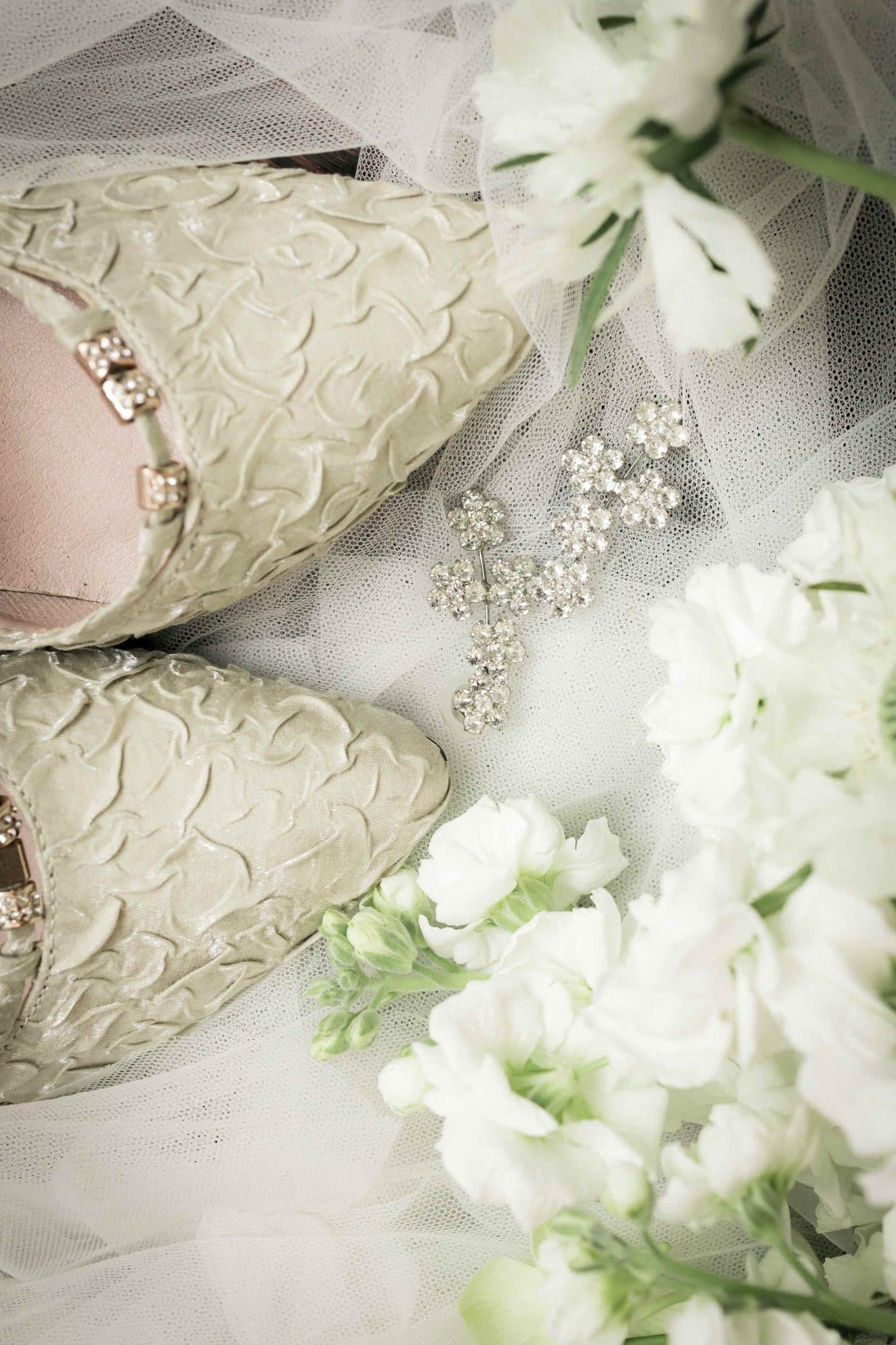 やわらかなチュールの軽やかさが、自然光とグリーンに美しく溶け込む一着