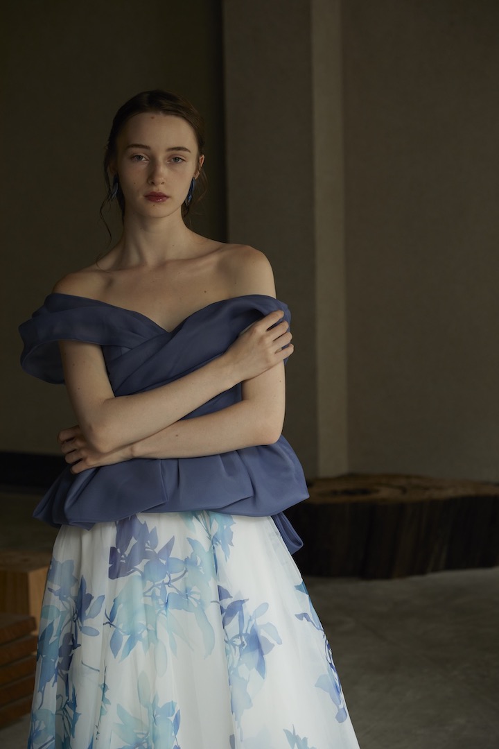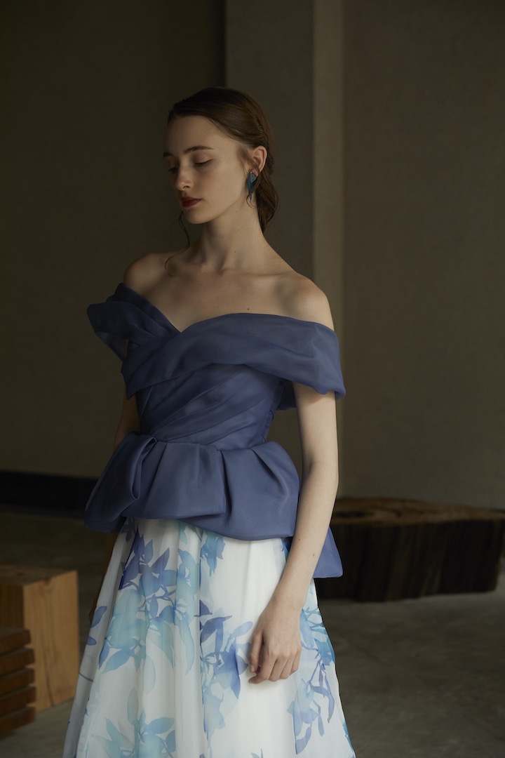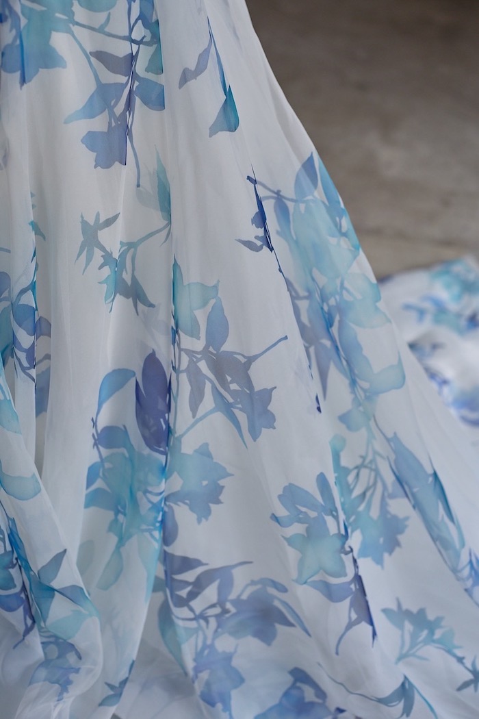 Blue heaven アーティストが描くBlue heaven フランス人作家のアートをオリジナルプリントに。 透明感溢れるオーガンジー素材のトップスのラグーンと ボタニカルアートが織りなす幻想的な1着 ご試着予約