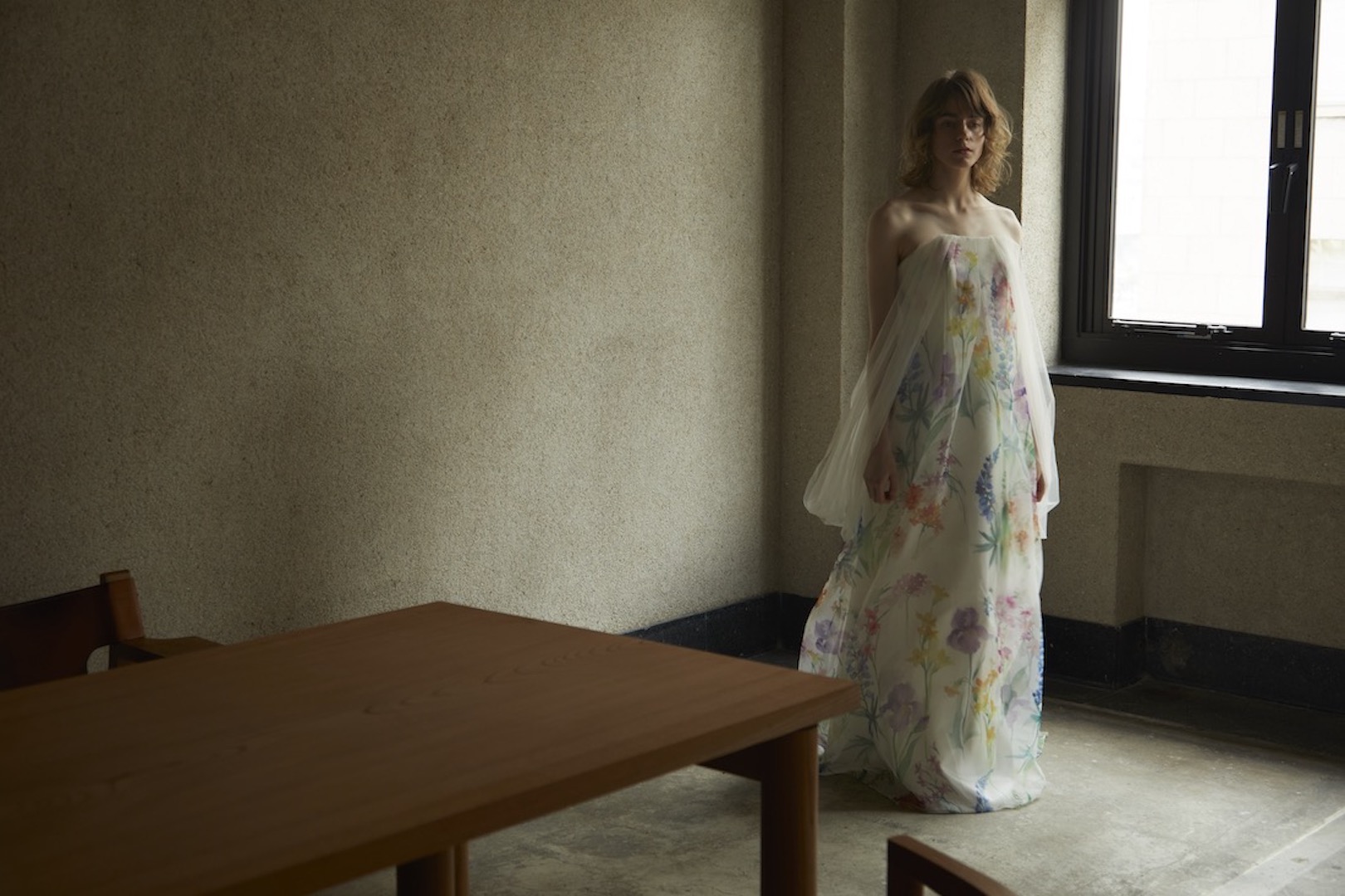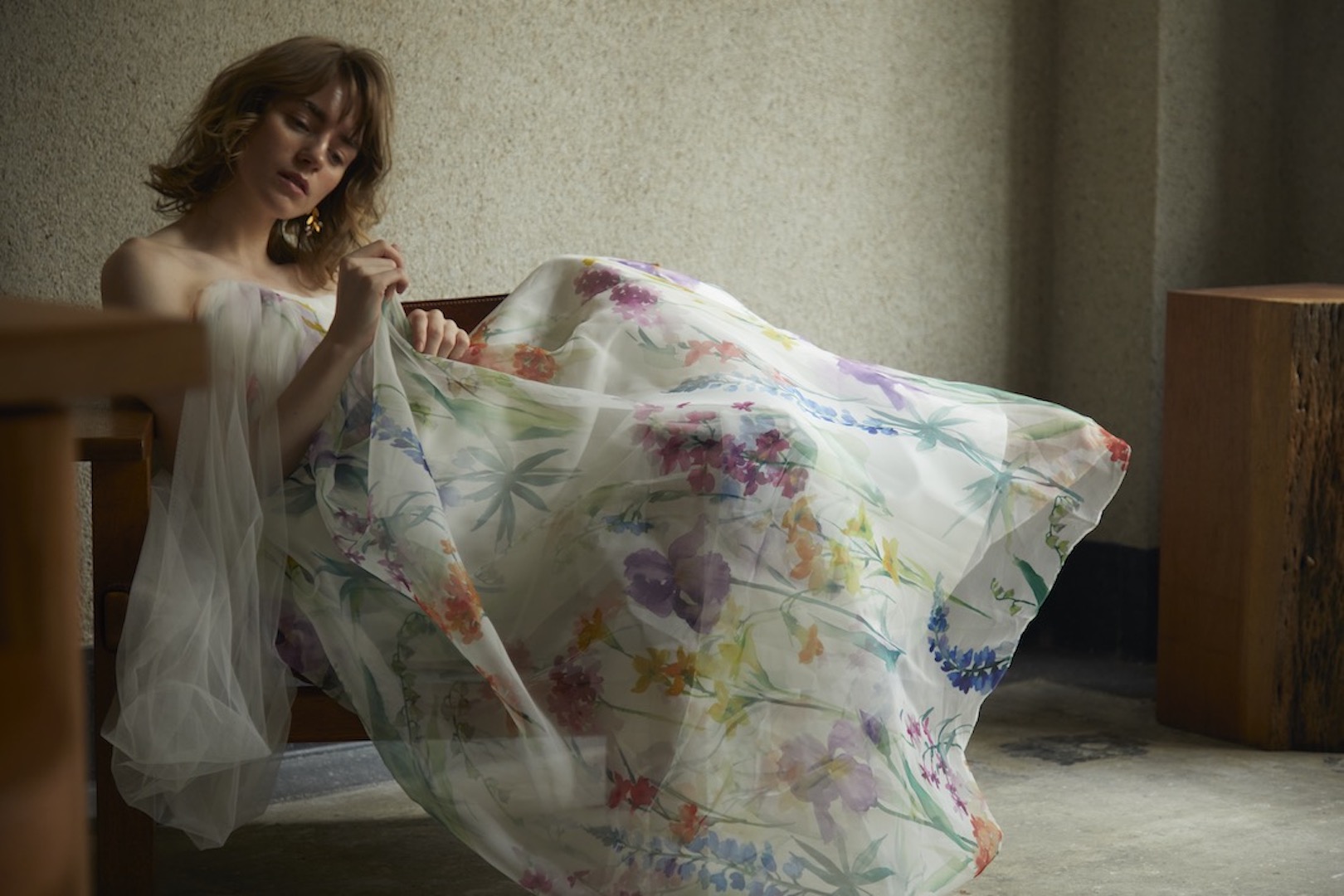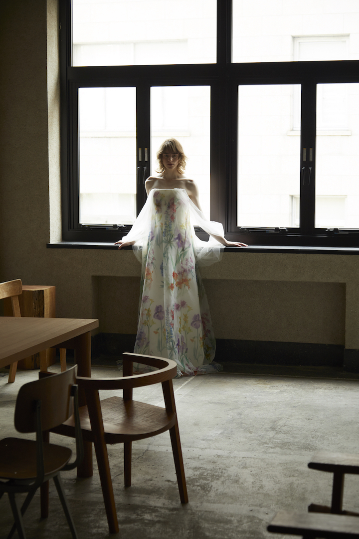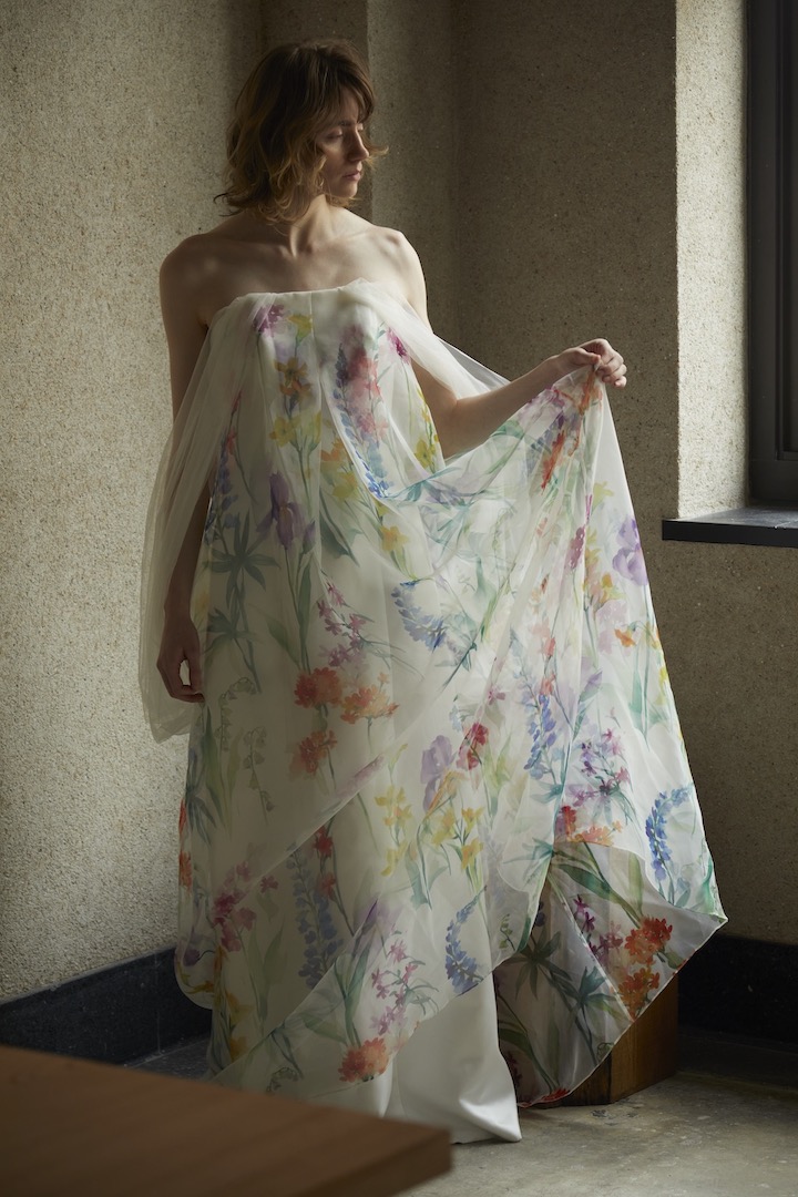 Flora ローマ神話に登場する花と春を司る女神 フランス人作家のアートをオリジナルプリントに。 色とりどりの咲き誇る花々を纏ったテントラインの下には、 シンプルなマーメイドのような1着が隠れている。 イリュージョンのようなダブルシルエットを愉しんで。 ご試着予約