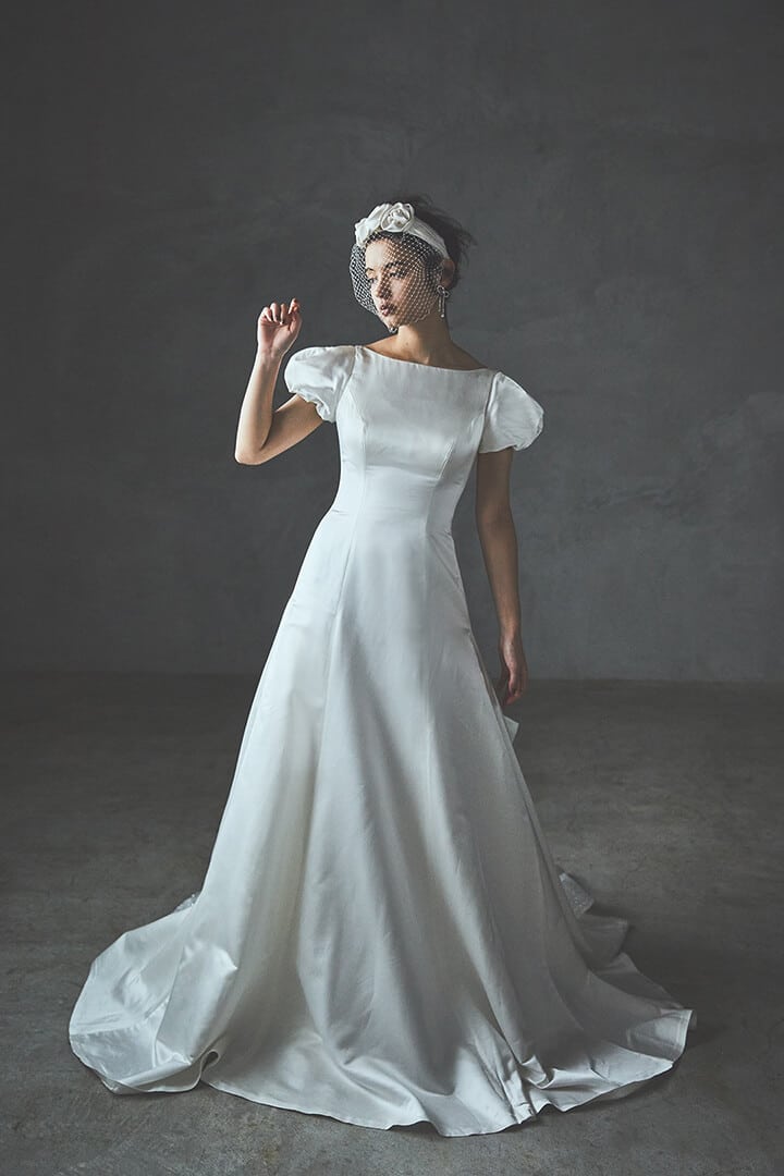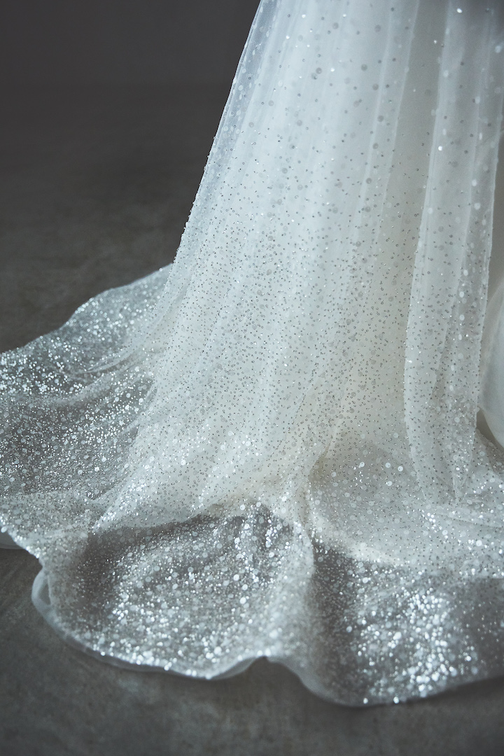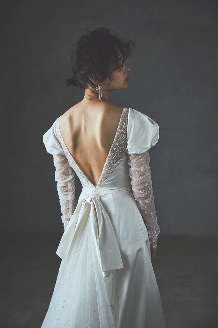 Milky way 煌めきのグラデーションを纏って。 「Milky way=天の川」と名付けられたこのドレスは、フロントは、イギリス製の上質なマテリアルだからこそ放たれる光沢感を生かしたシンプルなデザイン。一方、立ち去り姿は、天の川のような「煌めきのグラデーション」をトレーンに従えて、ドラマティックなフロントとのギャップを感じられるデザインに。煌めきのスリーブを纏えば、指輪交換やケーキカット、感謝のお手紙を読む際の手元を美しく煌めきで演出してくれる。 ミニパフスリーブがさりげなく可愛らしさも残してくれる。 ご試着予約