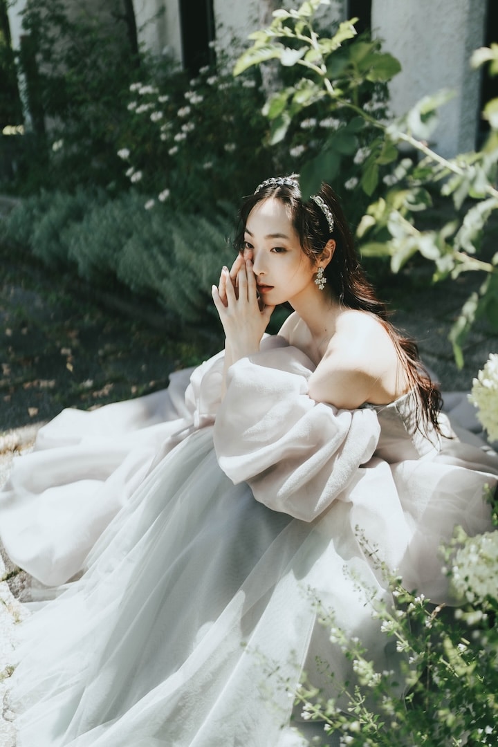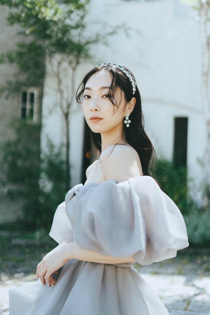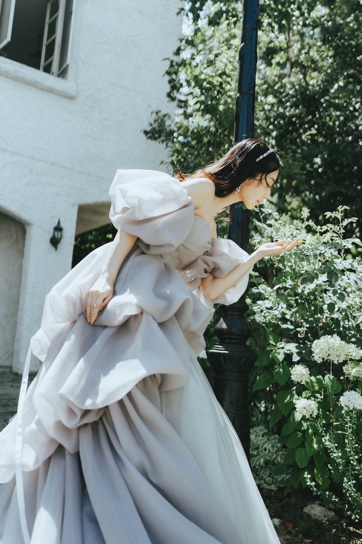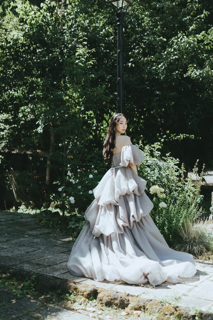 Misty 雲のようなシルエットとニュアンスのあるグレイッシュカラーが柔らかく花嫁を包み込む 雲のようにふんわりと広がるバルーンスカートとスリーブ。 華やかなシルエットながらも、 グレイッシュカラーが儚さを感じつつ記憶に残る1着。 オーバースカートとスリーブは取り外しが可能。 ご試着予約