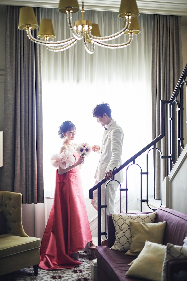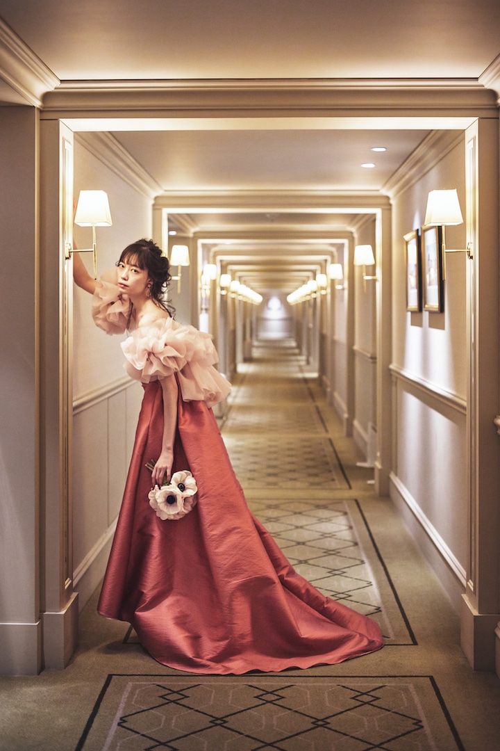 Peri 特別な1日に、ときめきと自信を。 表裏ツートーンカラーのミカド素材を使用。 フリルの中心には、ピンクパールとギャザリングしたチュールのディティールが心をときめかせます。 アンクル丈のスカートからはドレスカラーとマッチングさせたシューズやネイルを覗かせて。 ショルダーとバックデザインはそれぞれ取り外しが可能です。 ご試着予約