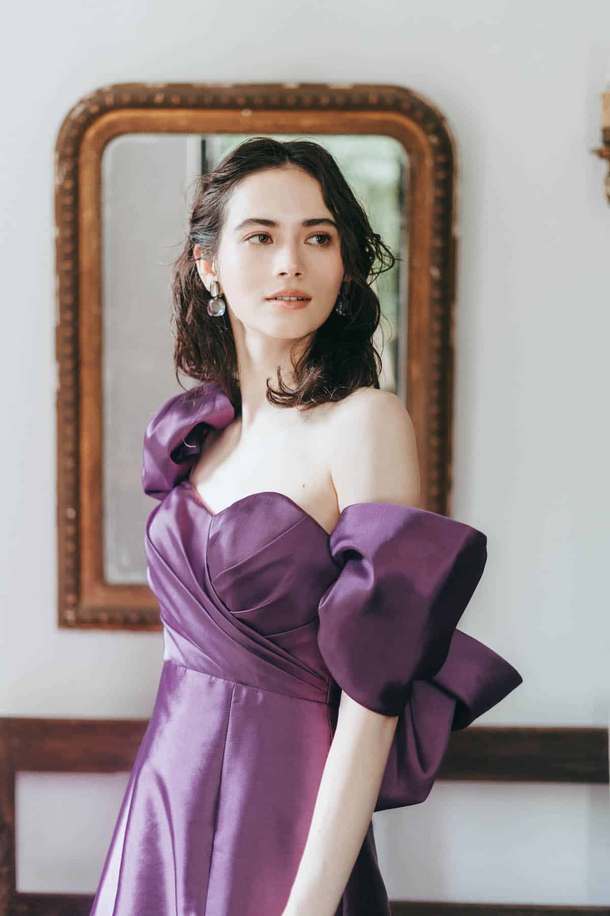 Plum バイカラーのイタリア製のミカドを使ったソフトマーメイド。MUSUBIモチーフを肩上と左脇の腕に通すことで優美でなだらかな斜めのラインが描かれる。ヒップラインを出しすぎず足元に向かって広がるマーメイドラインは、身体のシルエットを美しく演出し、存在感を引き立てます。 ご試着予約