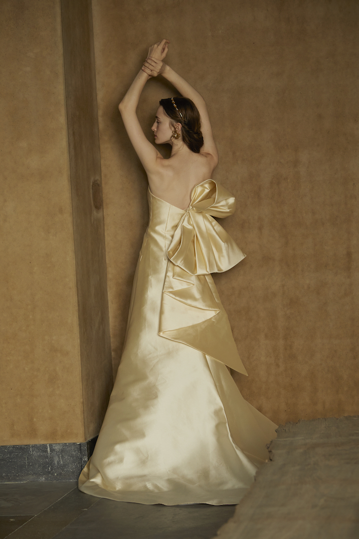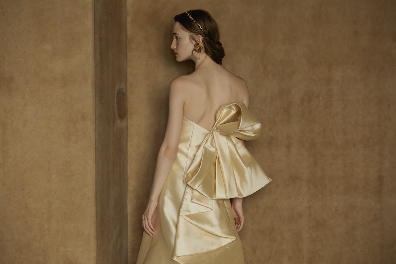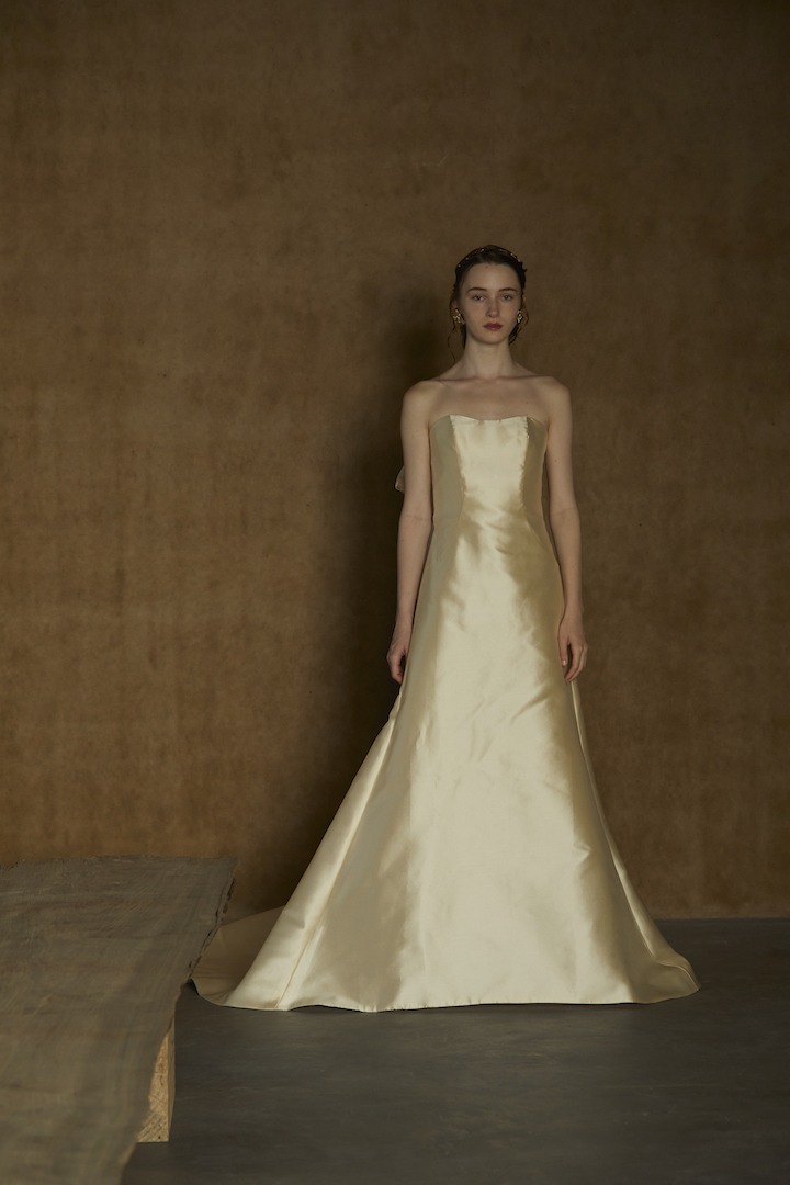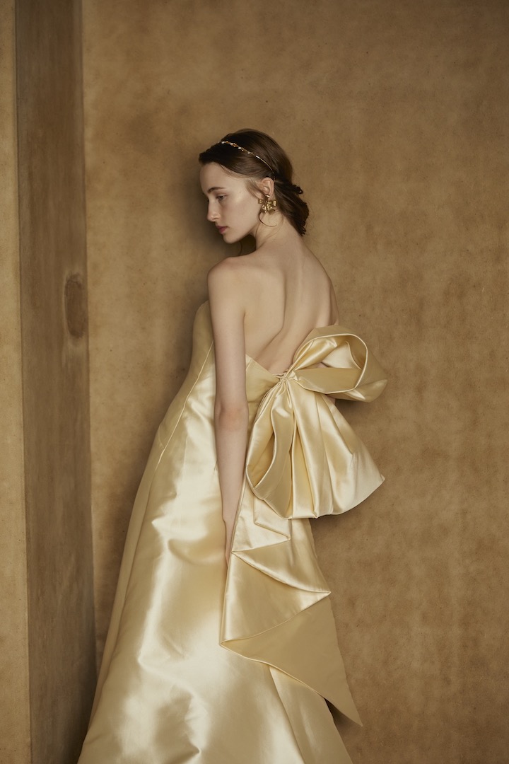 Serenity 薄黄金色の光と影を味方つけて、印象的な花嫁に 薄黄金色のスペイン製シルク混ミカド素材 上質さと軽やかさを体現したこの素材を纏うことで生まれる 光と影のコントスラストは、より印象的な花嫁像を演出してくれる。 ご試着予約