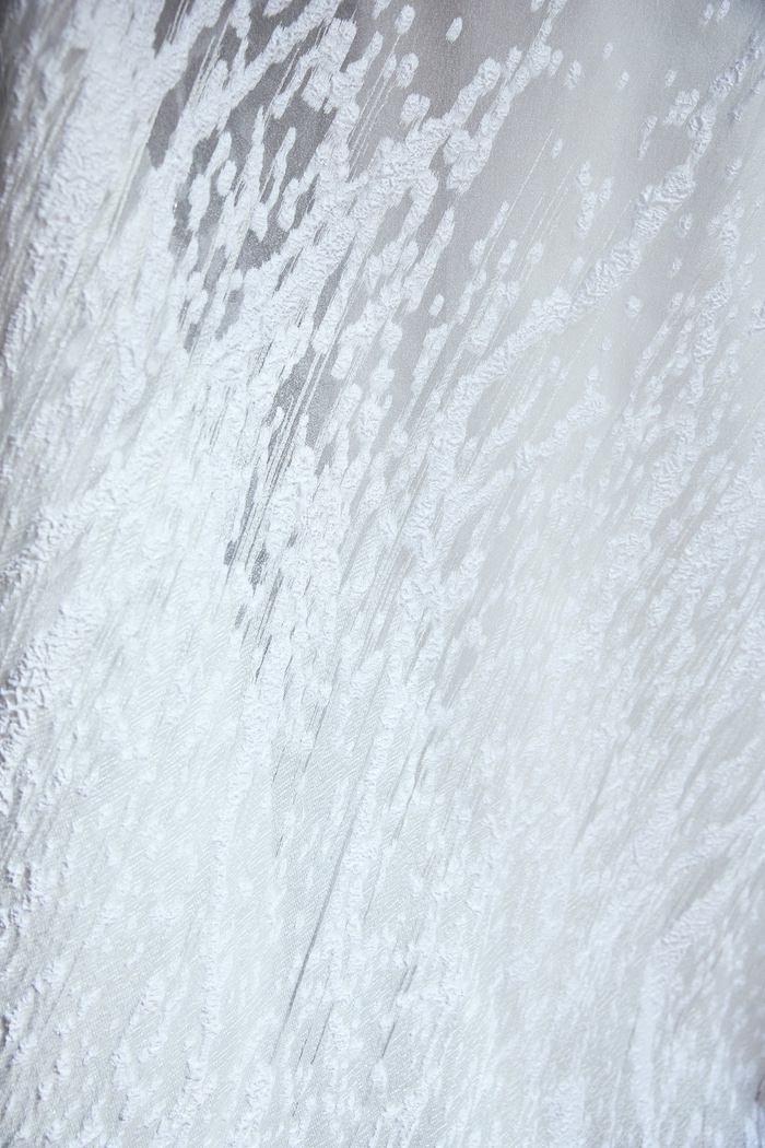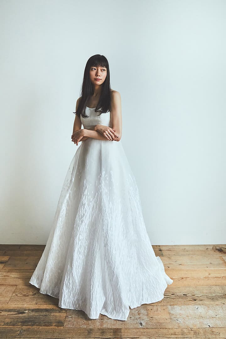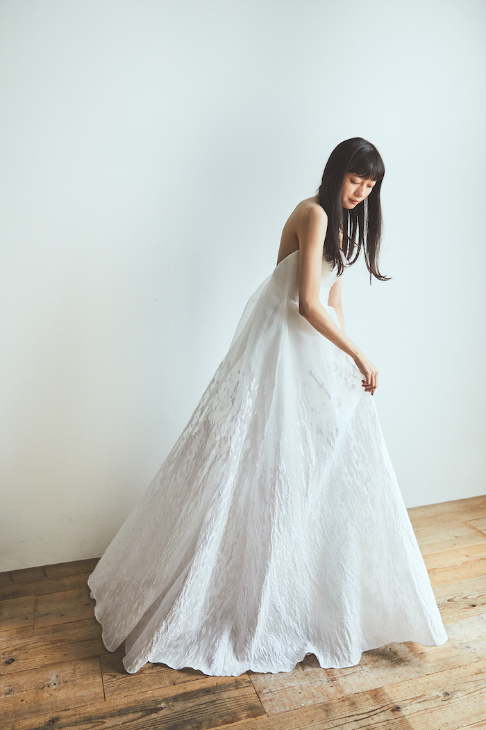 Snowflake 自然現象の瞬間を表現した奇跡のような一着。 トルコ製の立体的なジャカードオーガンジーは、まるでひらひらと煌めく雪の結晶や自然現象から生まれる有機的な模様がドレスを包みます。シンプルなデザインながらも、背中からマントのように有機的にスカートへと繋がるデザインに。オシャレ上級花嫁によるアクセサリーや小物で遊べる余白も残したデザイン。 ご試着予約