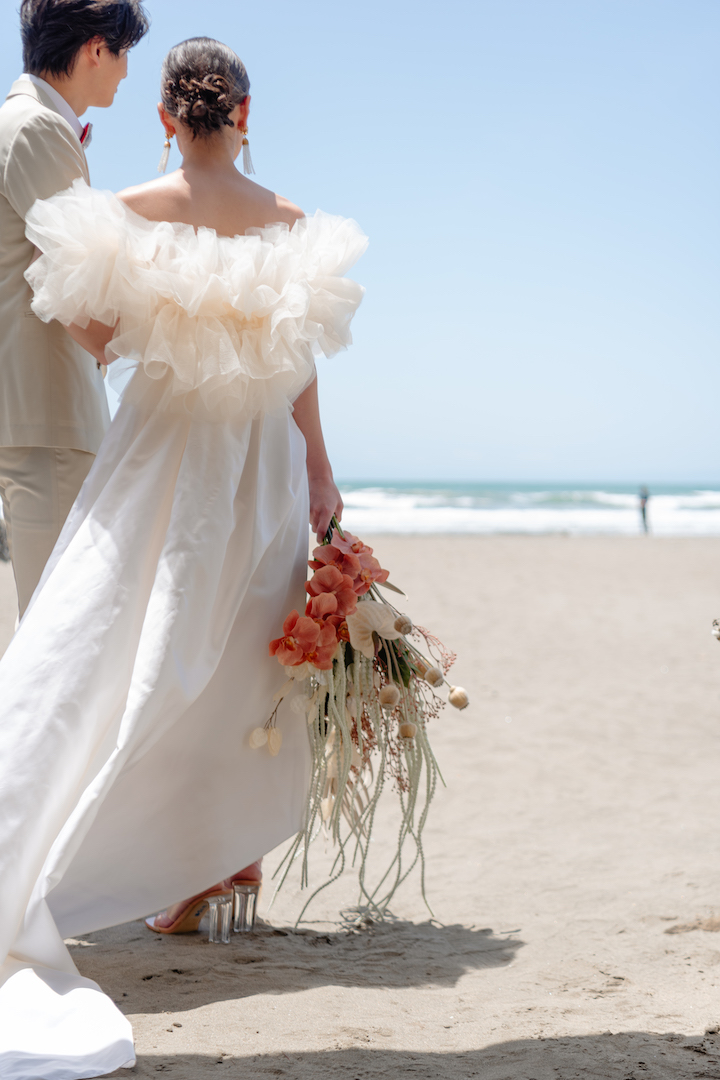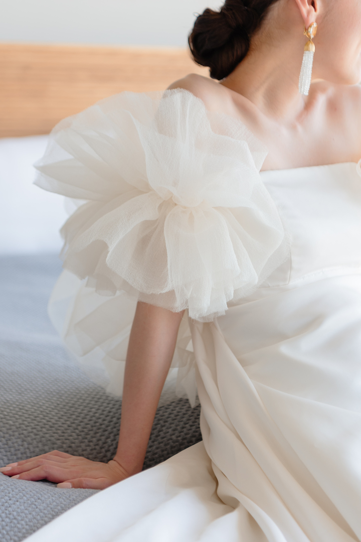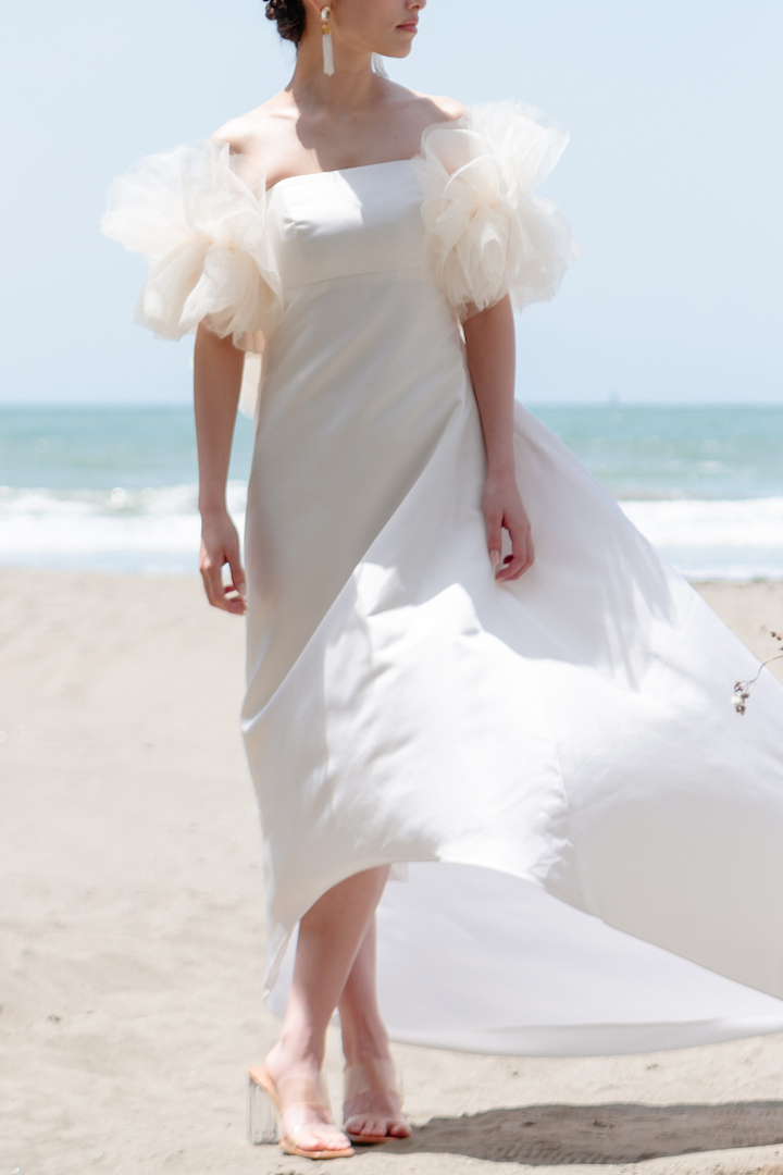 Sylf 歩く姿は可憐でアーティスティックに。 まるで和紙のような手触りのオーガンジーで作られたショルダーとバックデザイン。 どちらもそれぞれ取り外しが可能。 ミモレ丈のフロントスカートからはお気に入りのシューズを覗かせて。 シルク混タフタの軽やかな素材をなびかせて、心からウェディングを楽しめる1着。 ご試着予約