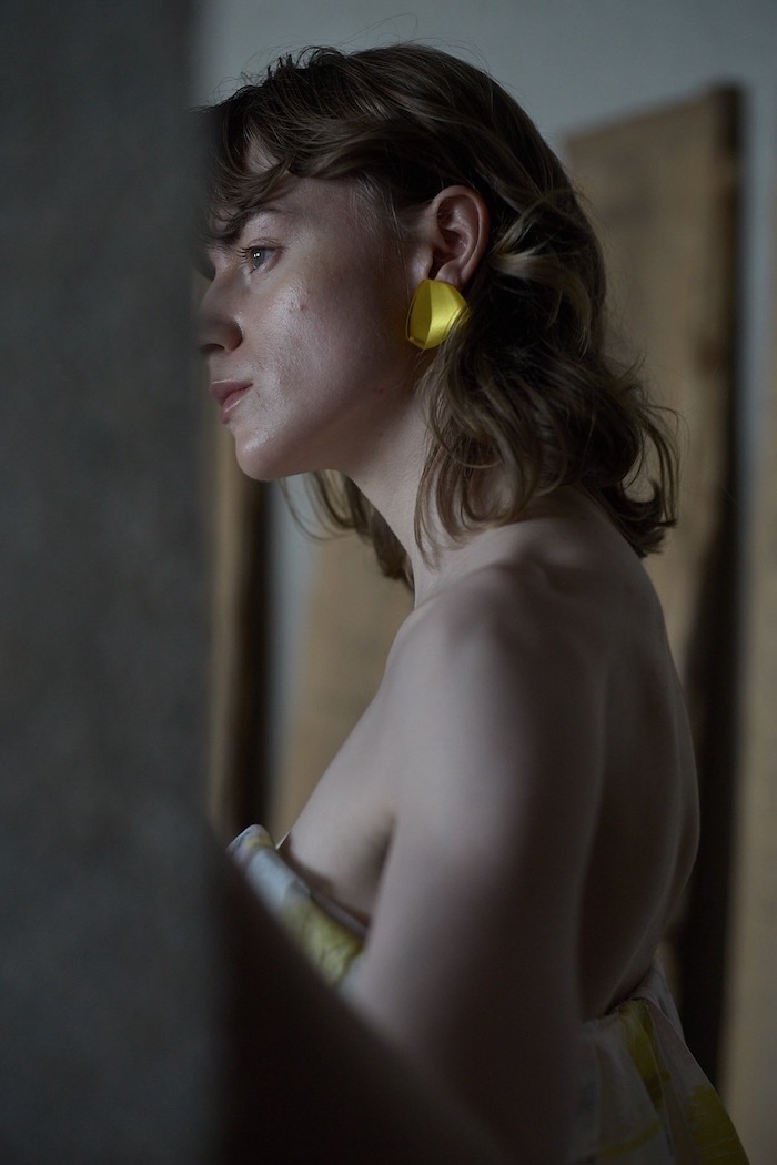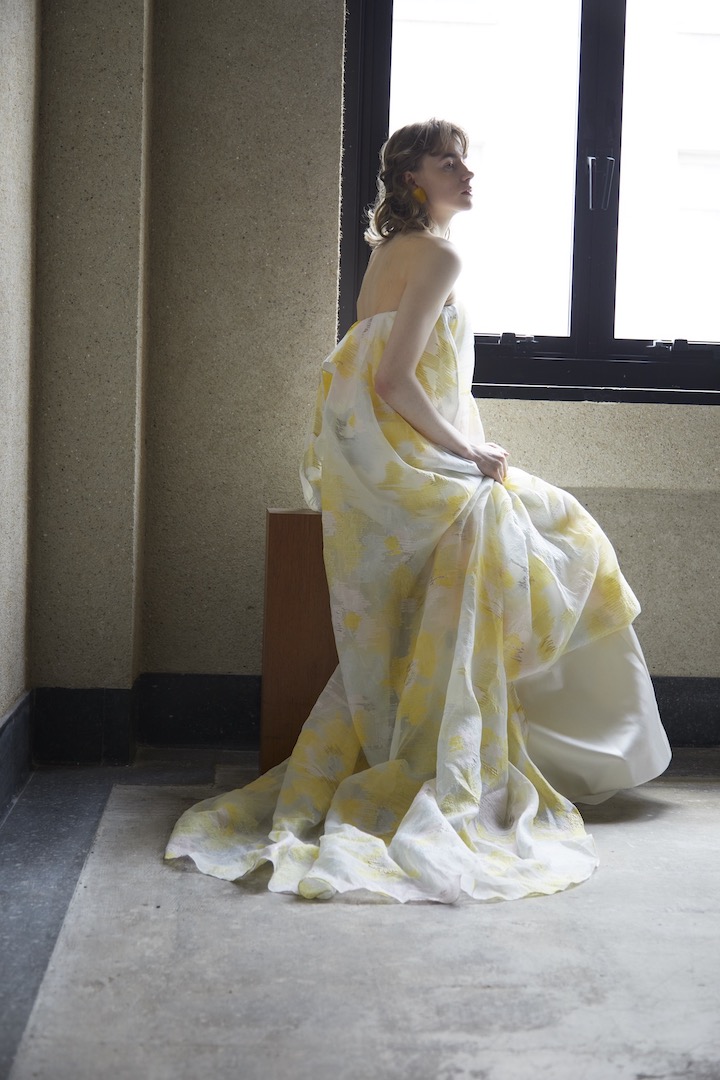 Twilight 黄金色に輝く 黄昏時の光を纏って アート作品のような黄金色の糸や銀糸が織りなすジャカード素材 透明感溢れるマテリアルは内側に纏ったマーメイドラインを 美しく包んでくれる。 光溢れる木漏れ日の中、また逆光やスポットを浴びた時にだけ その美しいシルエットが_見え隠れするダブルシルエット まるで黄昏時を纏ったような1着 ご試着予約