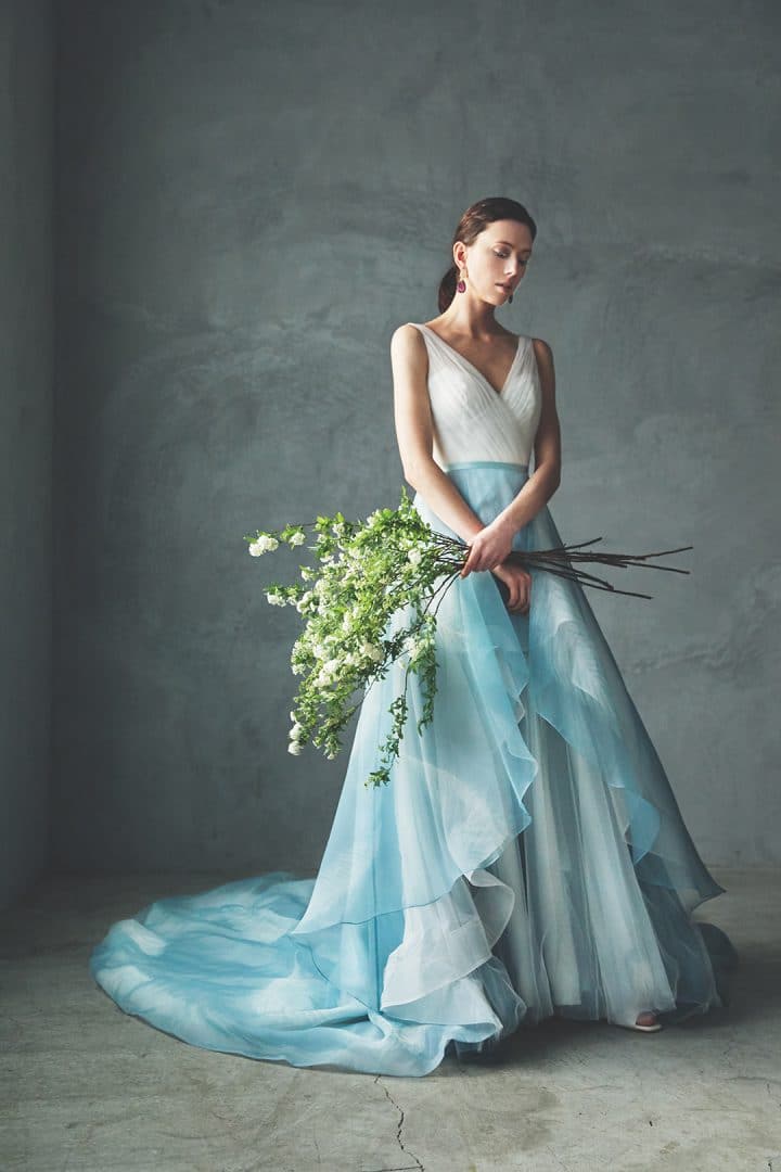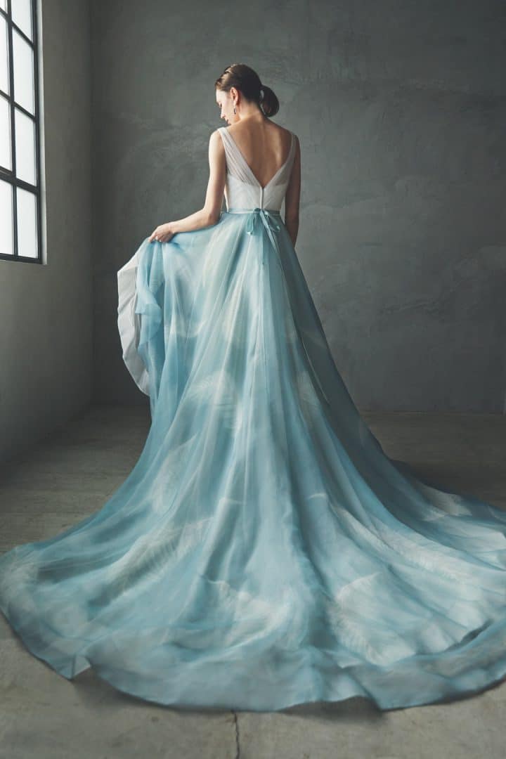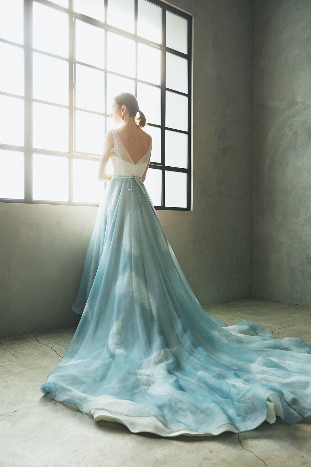 Blue Bird More beautiful with natural light and wind The print design incorporated feather art by Chiso where has a long history in Kyo-Yuzen in Kyoto. The skirt is made as a fine touch feather floating in the sky. The dyed organdy flutters by motion.