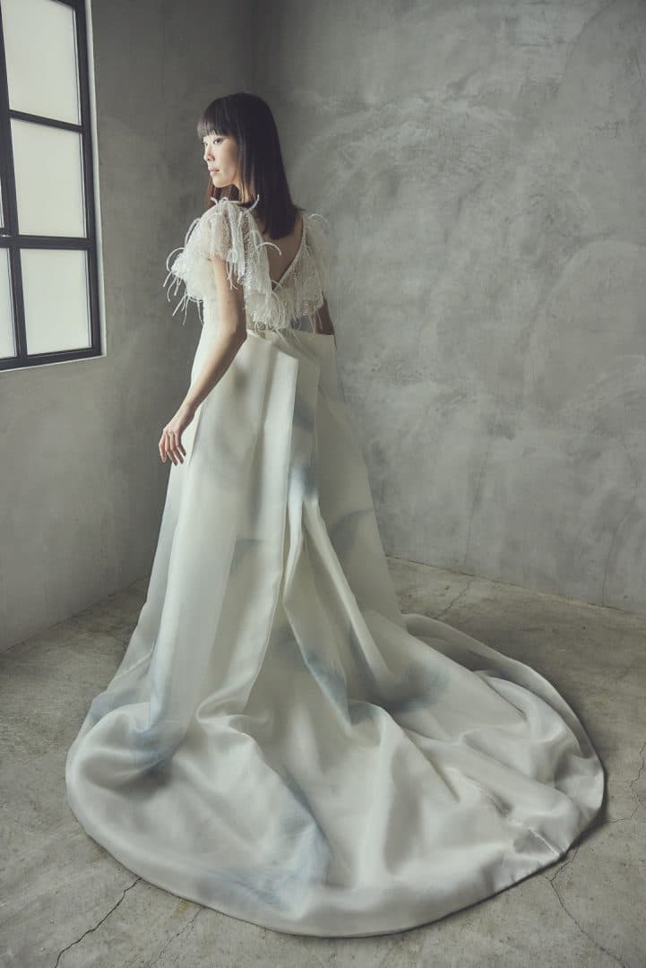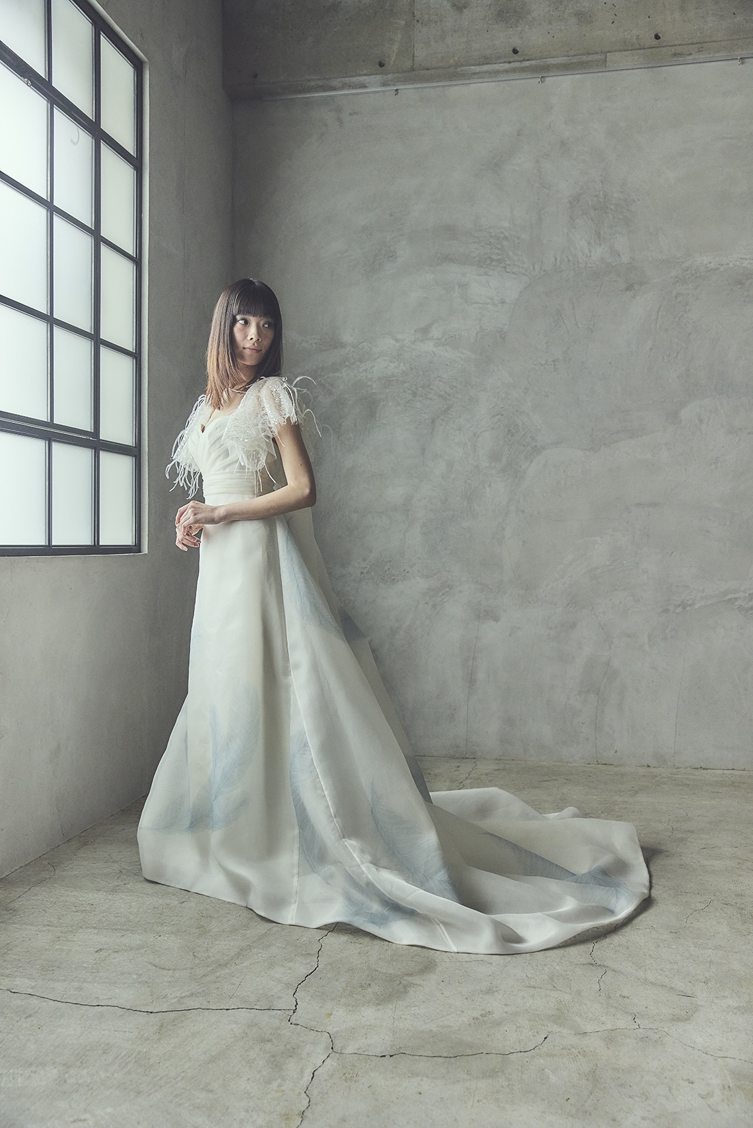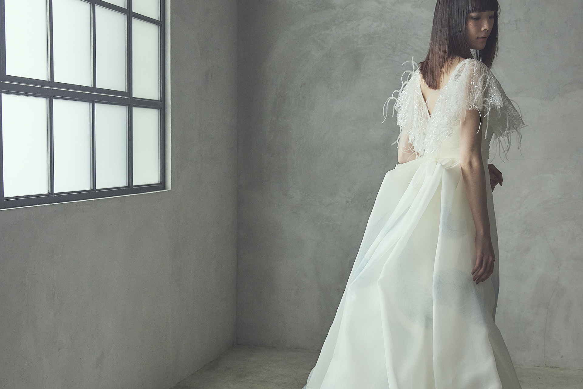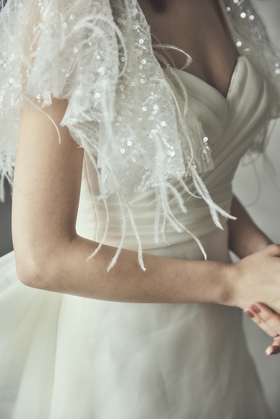 The shoulder detail is inspired by a feather swaying in the breeze and the sequins sparkle with the light.